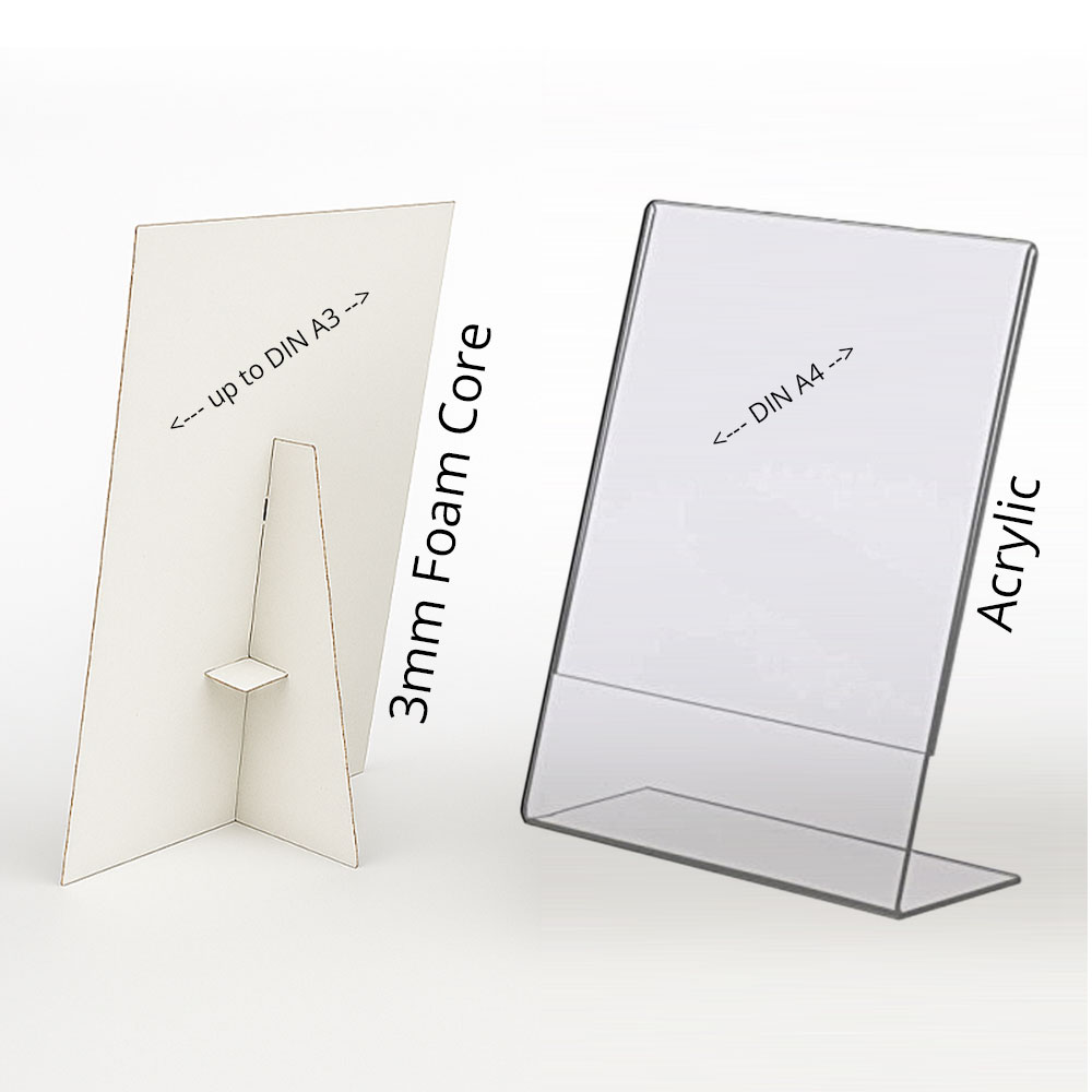 Showcase your designs on any tabletop with our two display options: a modern acrylic stand with double-sided inlay or a versatile foam board with integrated easel — simple, effective, and ready to impress. Different designs OK.